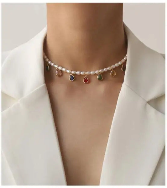 Colorful Zirconia Beads Natural Real Pearl Necklace Women Jewelry Party Designer T Show Runway Gown Japan Korean